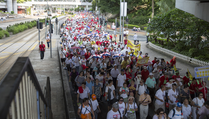 8月17日下午,在超過32度高溫的天氣情況下,集團領(lǐng)導(dǎo)和在港各部司員工及部分員工家屬800余人,積極響應(yīng)香港中國企業(yè)協(xié)會的呼籲,參加了香港「保普選、反占中」大聯(lián)盟發(fā)起的「和平普選大遊行」,表達港中旅員工擁護「一國兩制」和基本法、依法實施普選的願望和訴求。張學(xué)武董事長和姜巖董事副總經(jīng)理到維園集會現(xiàn)場為大家加油鼓勁,張逢春總會計師、許慕韓副總經(jīng)理等集團領(lǐng)導(dǎo)和員工隊伍一起全程參加了遊行。