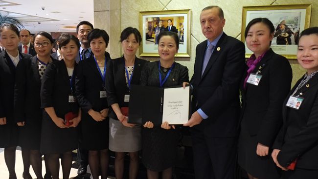 9月5日下午,土耳其總統(tǒng)埃爾多安離開酒店前,對杭州維景的服務(wù)深表滿意,在衆(zhòng)多媒體的關(guān)注下,爲杭州維景簽名留念,幷與管理人員合影,感謝杭州維景提供的溫馨、細緻、周到的服務(wù),同時盛情邀請酒店員工去土耳其觀光遊覽。