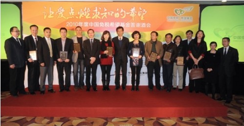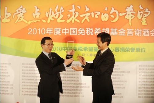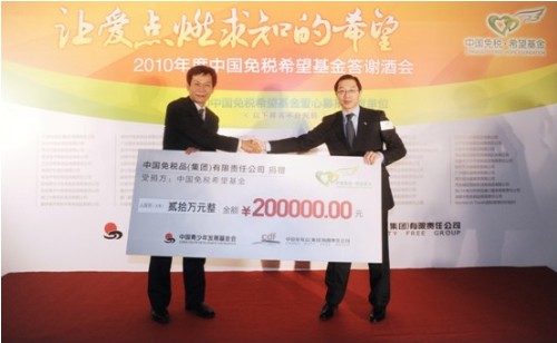 中國青少年發(fā)展基會(huì)秘書長涂猛先生致辭。中國免稅品(集團(tuán))有限責(zé)任公司副總裁陳國強(qiáng)先生代表中國免稅希望基金致了答謝詞。中免集團(tuán)全體領(lǐng)導(dǎo)上臺(tái),向 “2010年度中國免稅希望基金愛心募捐榮譽(yù)單位”頒發(fā)獎(jiǎng)牌。隨后,為了表彰中免集團(tuán)發(fā)起并成立僅僅三年的“中國免稅希望基金”為中國公益事業(yè)做出的突出 貢獻(xiàn),中國青少年發(fā)展基金會(huì)把特別設(shè)立的“希望工程20年杰出公益伙伴”獎(jiǎng)?lì)C發(fā)給中免集團(tuán)。