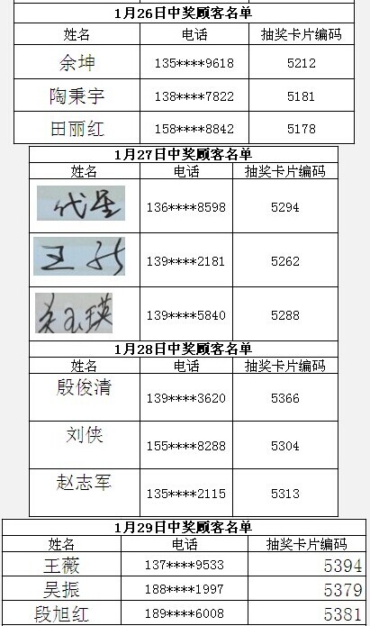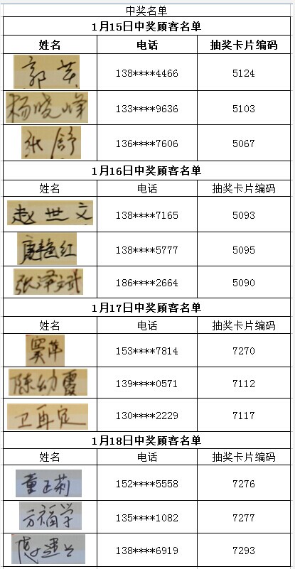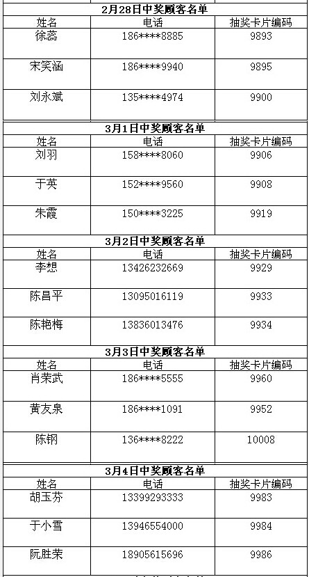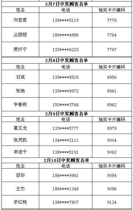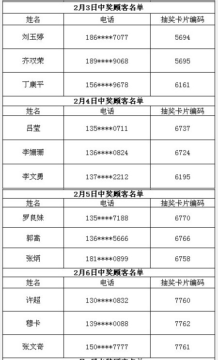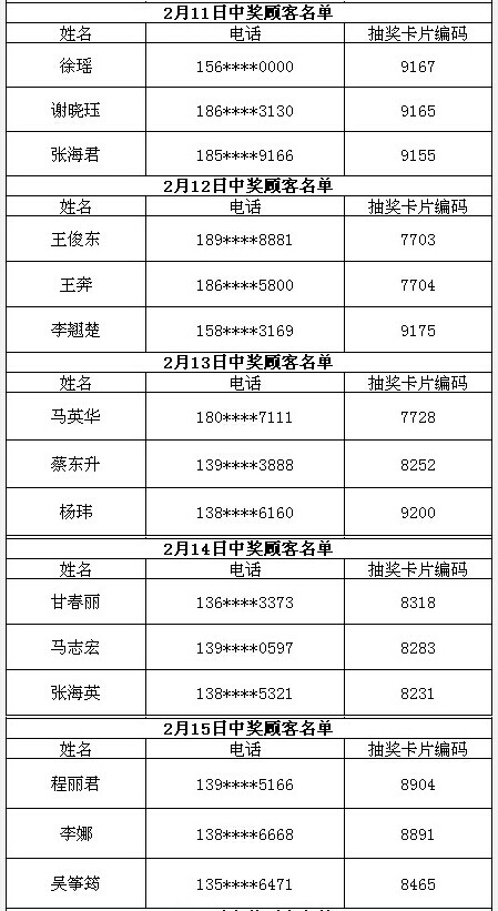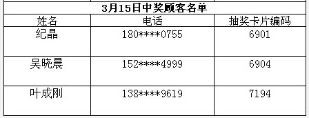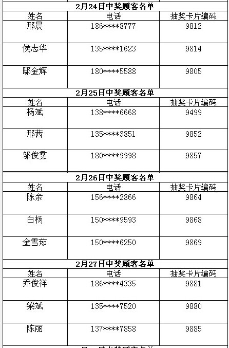 每日中獎名單公布如下: