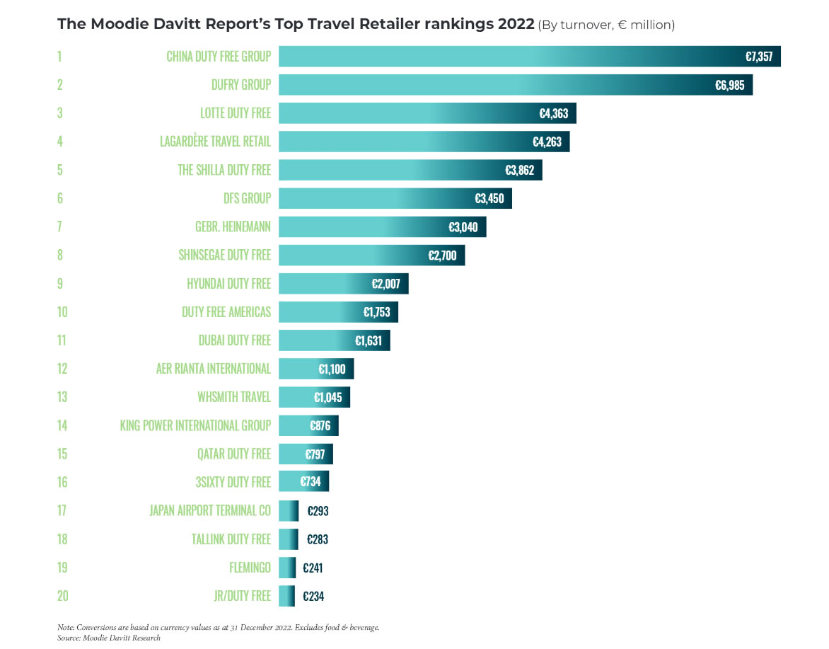 2023年8月28日,全球旅游零售行業(yè)權(quán)威媒體《穆迪達(dá)維特免稅報(bào)告》(The Moodie Davitt Report)發(fā)布《全球領(lǐng)先旅游零售商報(bào)告》,對(duì)過(guò)去一年來(lái)全球前20名旅游零售商展開(kāi)了跟蹤評(píng)估。報(bào)告顯示,根據(jù)2022年?duì)I業(yè)額統(tǒng)計(jì),中免集團(tuán)連續(xù)第三年在全球頂級(jí)旅游零售商中保持領(lǐng)先地位,成為2022年全球最大旅游零售商。