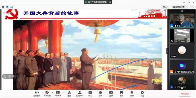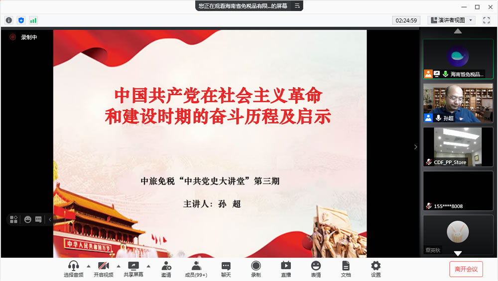 2021年5月27日,中旅免稅黨委舉辦第三期“黨史大講堂”專題培訓(xùn)。根據(jù)中旅免稅黨委“黨史大講堂”培訓(xùn)工作安排,此次活動(dòng)由海南省免稅品有限公司黨委組織承辦,海南省免稅品有限公司黨委班子成員和機(jī)關(guān)黨支部全體黨員在會(huì)議室集中參加線上培訓(xùn),中旅免稅其他各級(jí)黨組織黨員和入黨積極分子共600余人通過(guò)視頻方式線上參會(huì)。